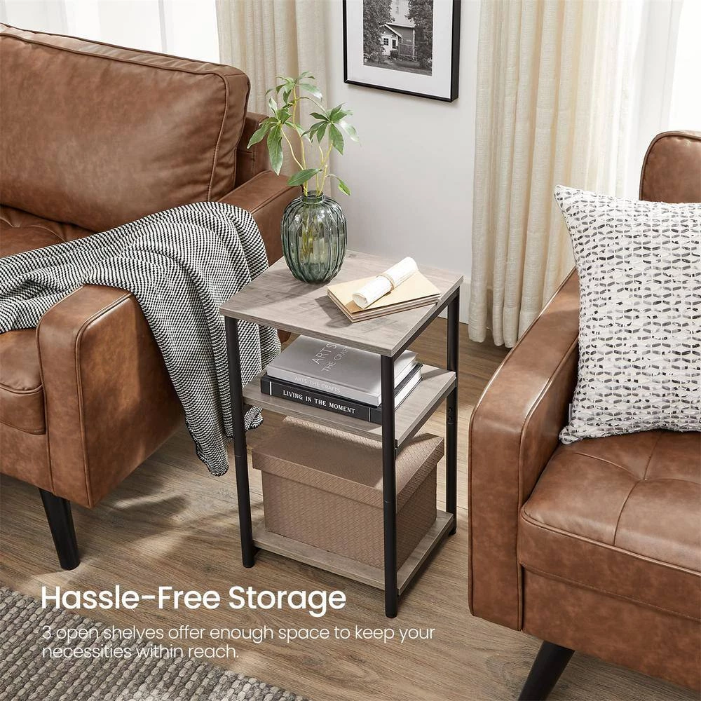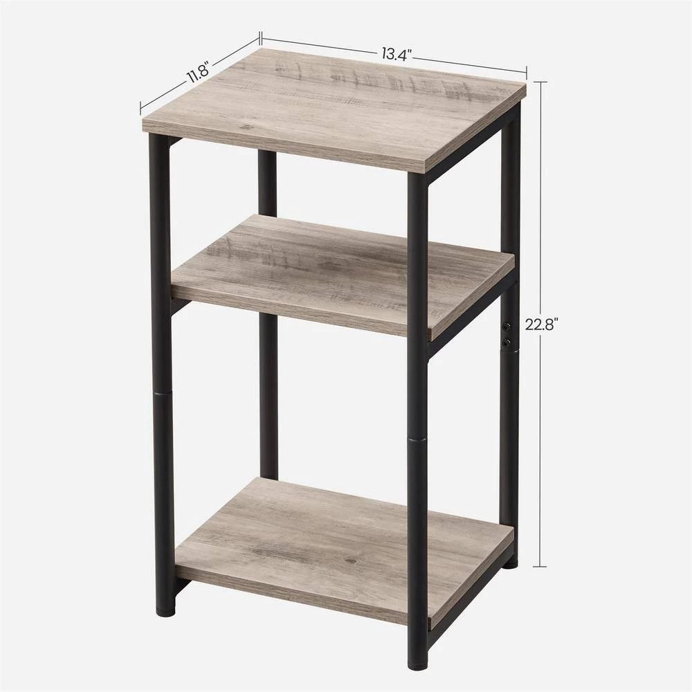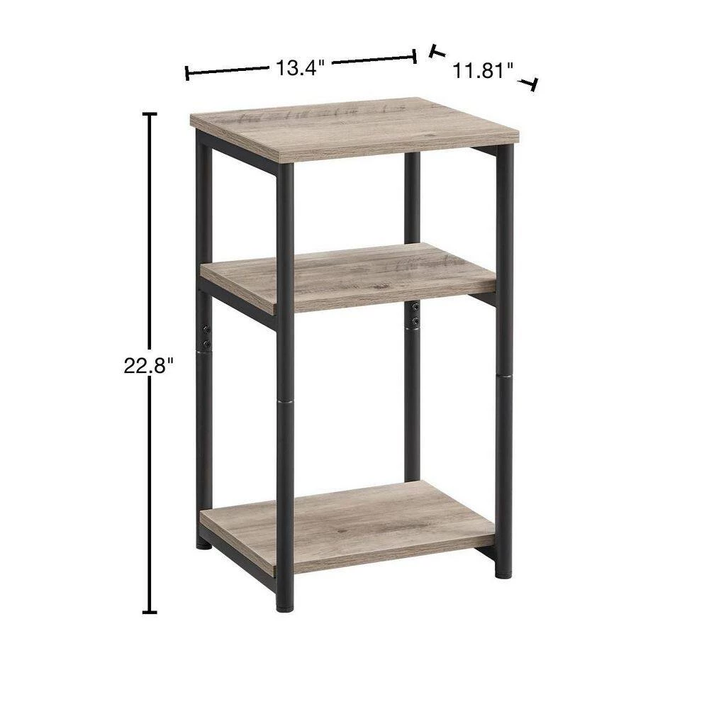 - Standing at 13.4 in. L x 11.8 in. W x 22.8 in. H, this end table takes up little floor space while serving as a catchall with 3 storage tiers-stage a chamomile cup on the top, a basket on Bottom, and your tablet in the middle