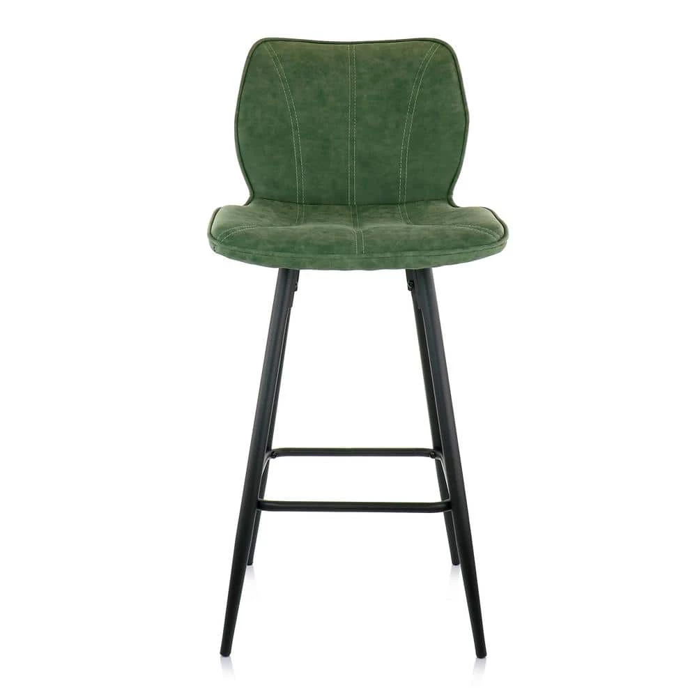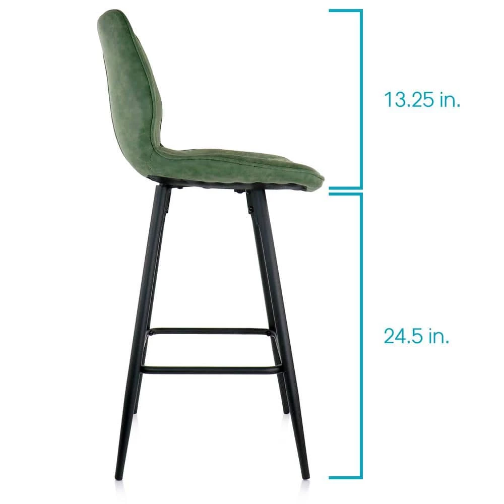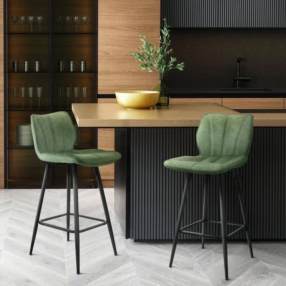 Add a stylish touch to your home bar or kitchen counters with the Elama 2 Piece Faux Leather Bar Chair in Green with Metal Legs. This set of chairs is uniquely shaped to form to you while seated. No arms allow you to seat the stools next to each other without worrying about lack of space. These chairs are crafted from quality metal and faux leather for a strong and long lasting design. The shell like stitched pattern adds a stylish accent to any home decor.