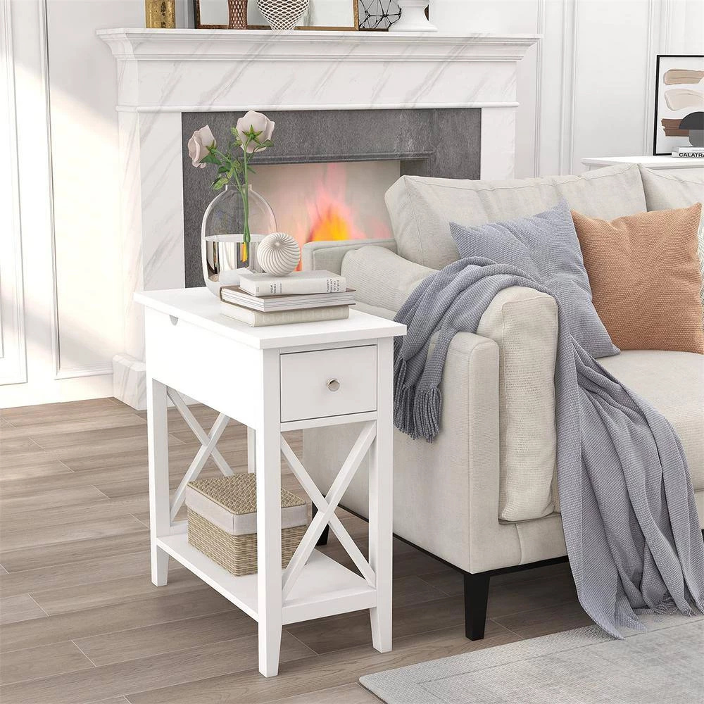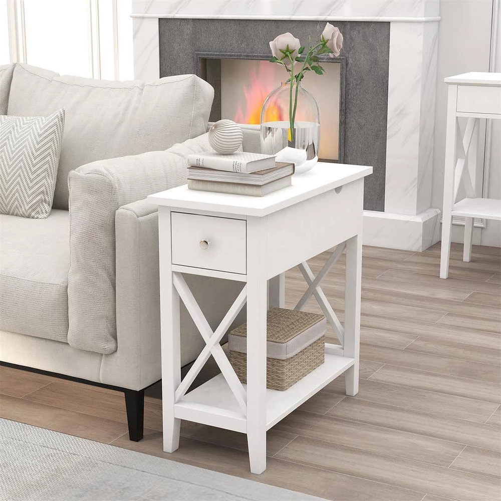 - Features of narrow end table with open shelf and drawer for storing small things like remote controllers, snacks and so on, easily and neatly organize your bedroom and living room.