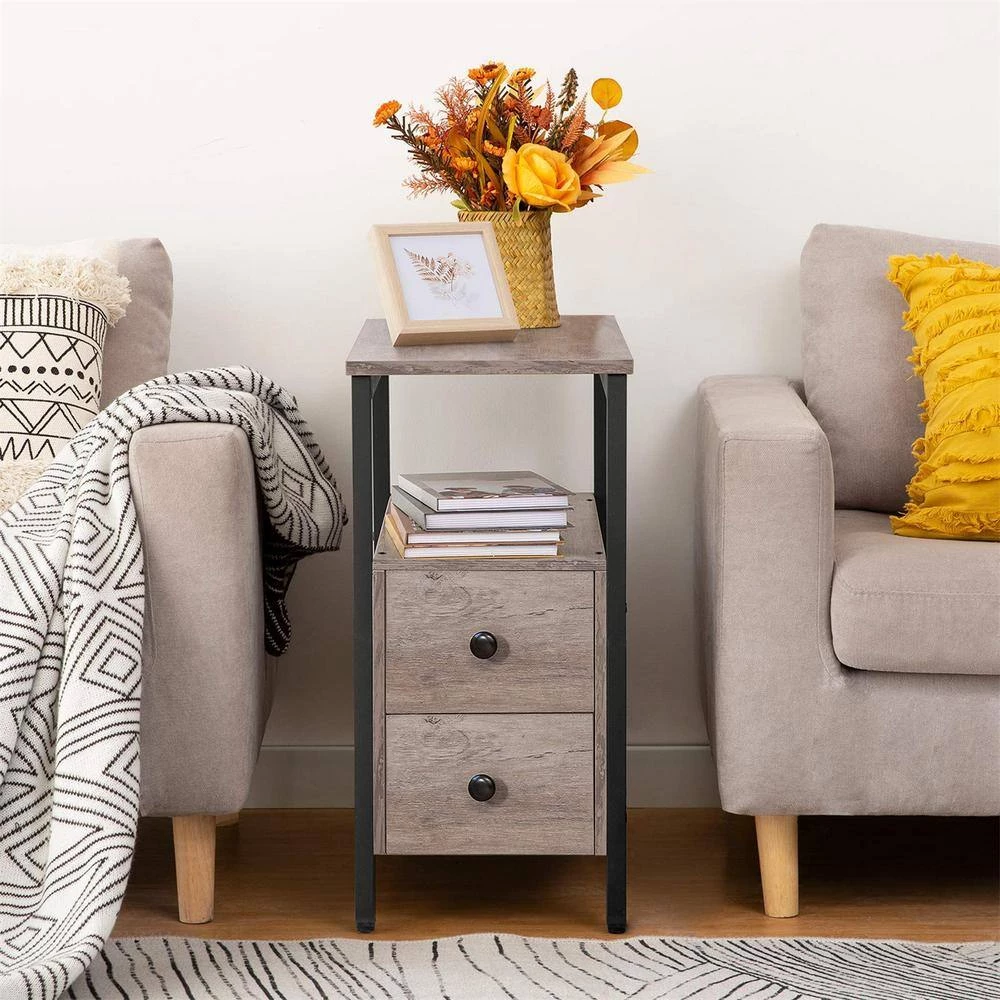 Retro yet trendy wooden board in greige brings the brand new, fresh experience to your home. Combined with the black metal frame, we create a new industrial style end table for you.Assembly was pretty easy. Parts are well-labeled and pieces fit well. These tables fit well into some narrow spaces, and the empty space above the drawers is really helpful for storage.
