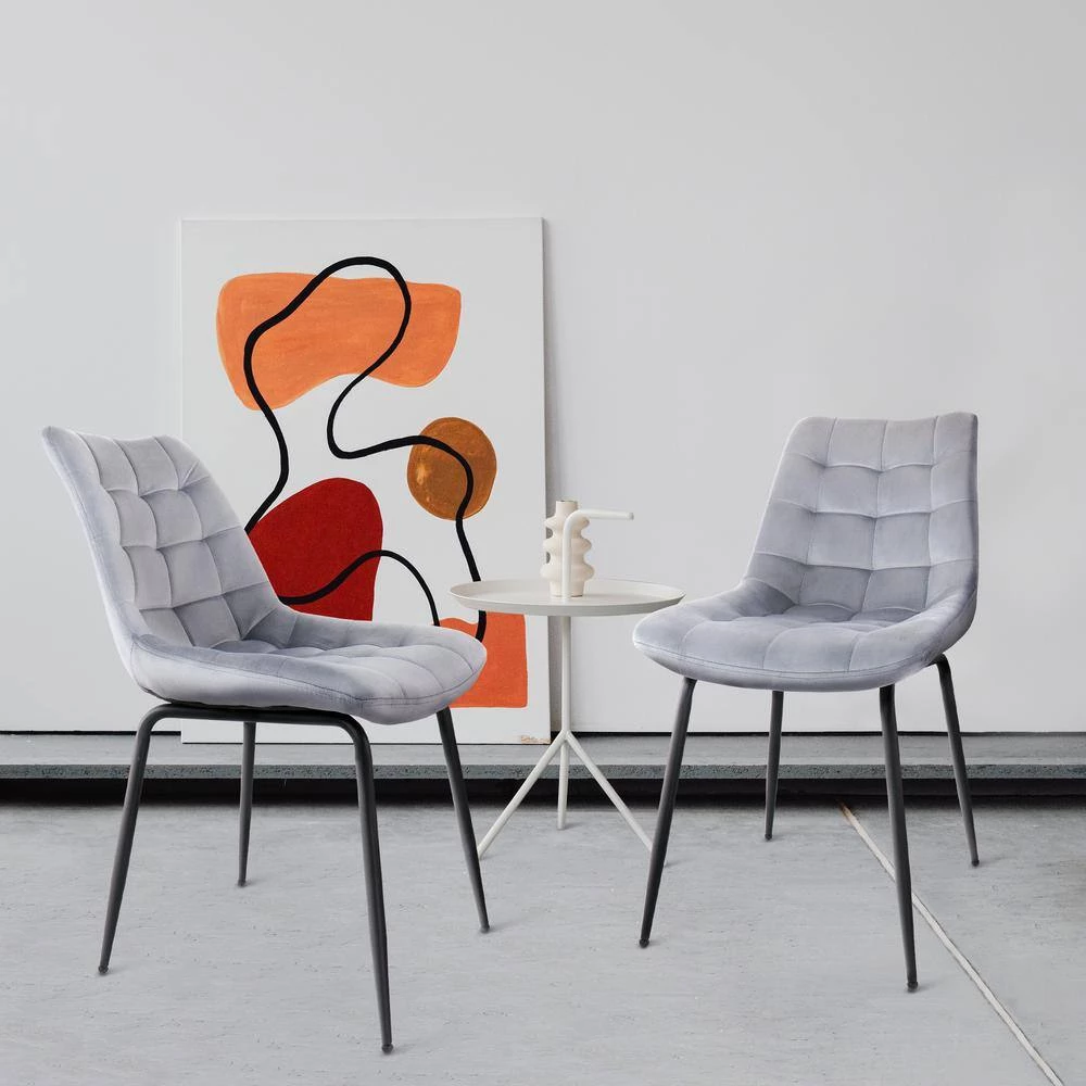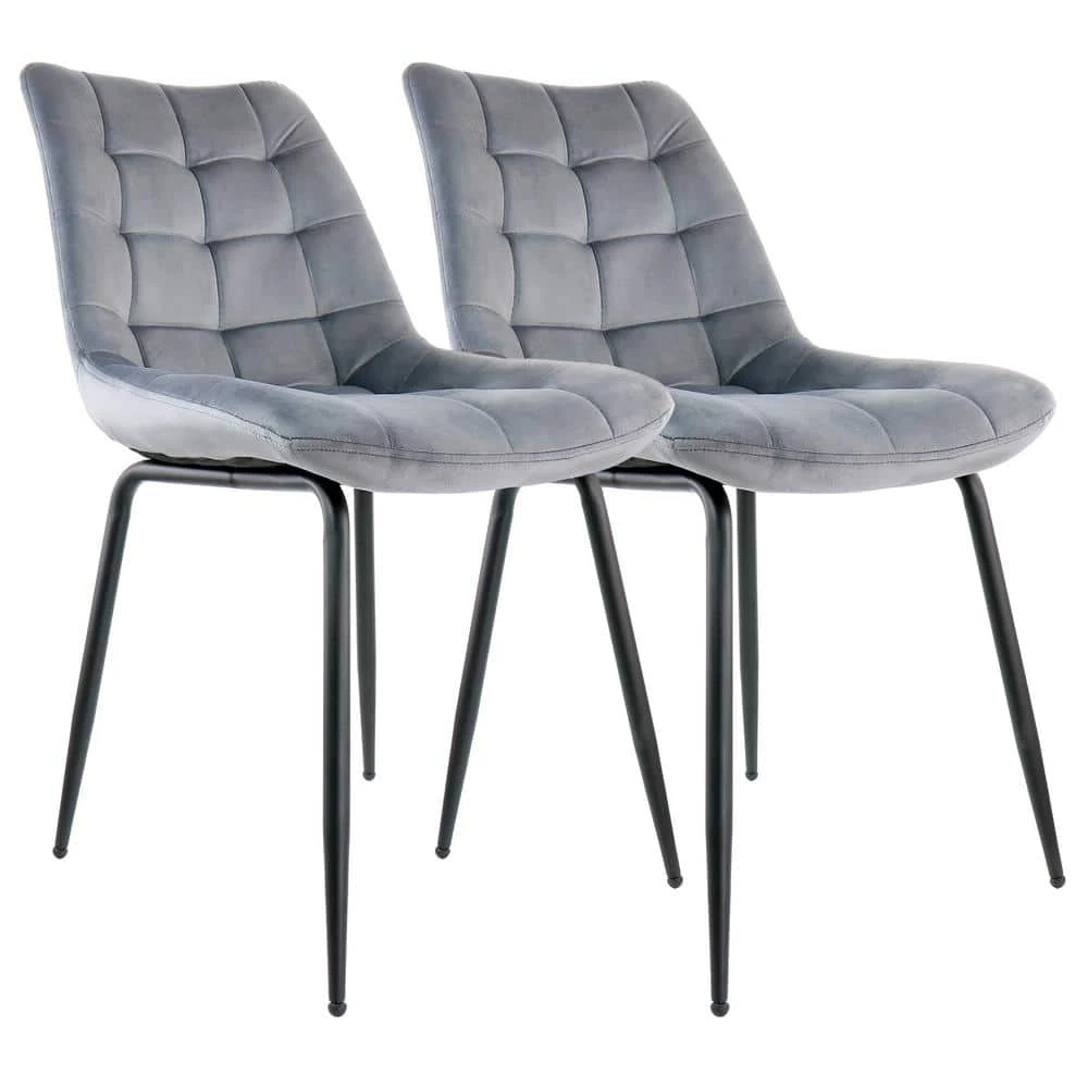Add a touch of elegance to your living room or work space with the Elama 2 Piece Tufted Chair in Gray with Metal Legs. This set of chairs is crafted with a velvet square stitch designed upper and sturdy metal legs. These chairs are perfect for relaxing on in front of the tv or getting some work done in style in your home office. Designed with a slight lean for back comfort.