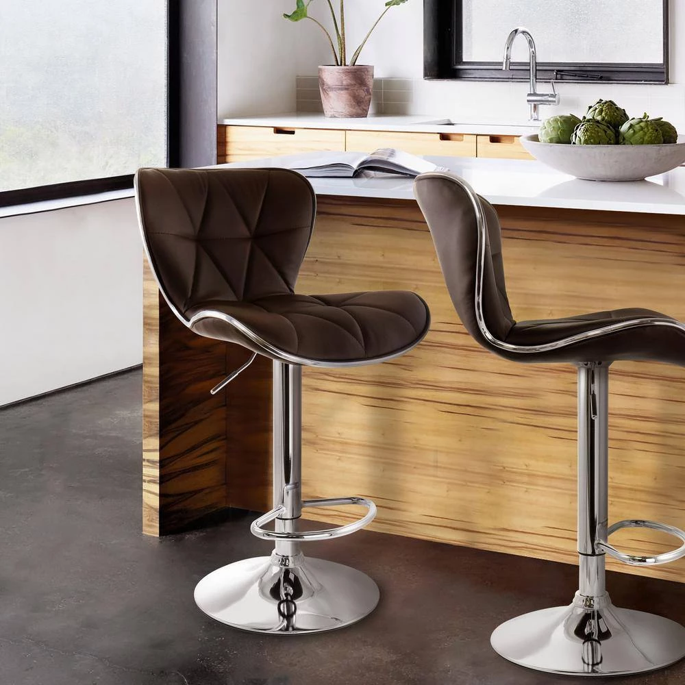 Add a stylish touch to your home bar or kitchen counters with this set of 2 Elama Tufted Faux Leather Adjustable Bar Stools in Brown. These bar stools are crafted with quality faux leather and sturdy metal for long lasting use. The diamond tufted cushion is designed with roUnded edges for a classy and unique look. Armless design saves space at your counters, allowing you to push these stools in and fit side by side without the bulk of arm rests. Swivel base features a foot rest and adjustable height, making this set of stools customizable to different heights and spaces.