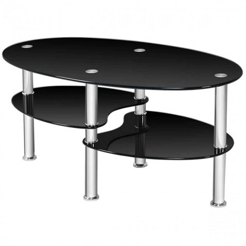 The oval shape looks modern and you can put your tea cups, flowers and books on the first shelf, the second shelf could used as storage shelf.Tempered glass board is more safe than normal glass. Metal legs are sturdy and light, it’s easy to move.This glass coffee table is easy to install.