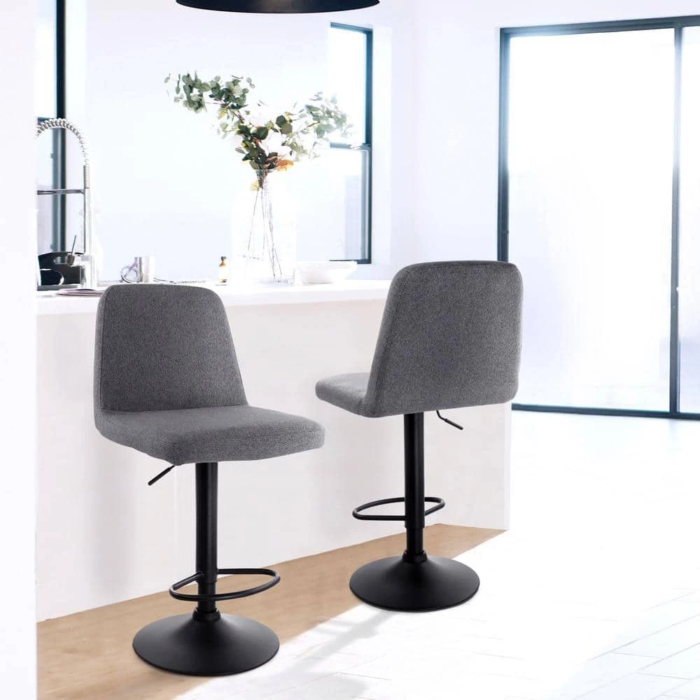 Add a stylish touch to your home bar or kitchen counters with the Elama 2-piece gray fabric bar stool with black base. This set of bar stools is made of quality fabric and durable metal for a sturdy long lasting design. Simple squared seat cushion is made of soft heathered fabric for ultimate comfort while the adjustable swivel base lets you customize height to your specific needs. Features a foot rest and a matte finish for a casual take on a classic bar stool.