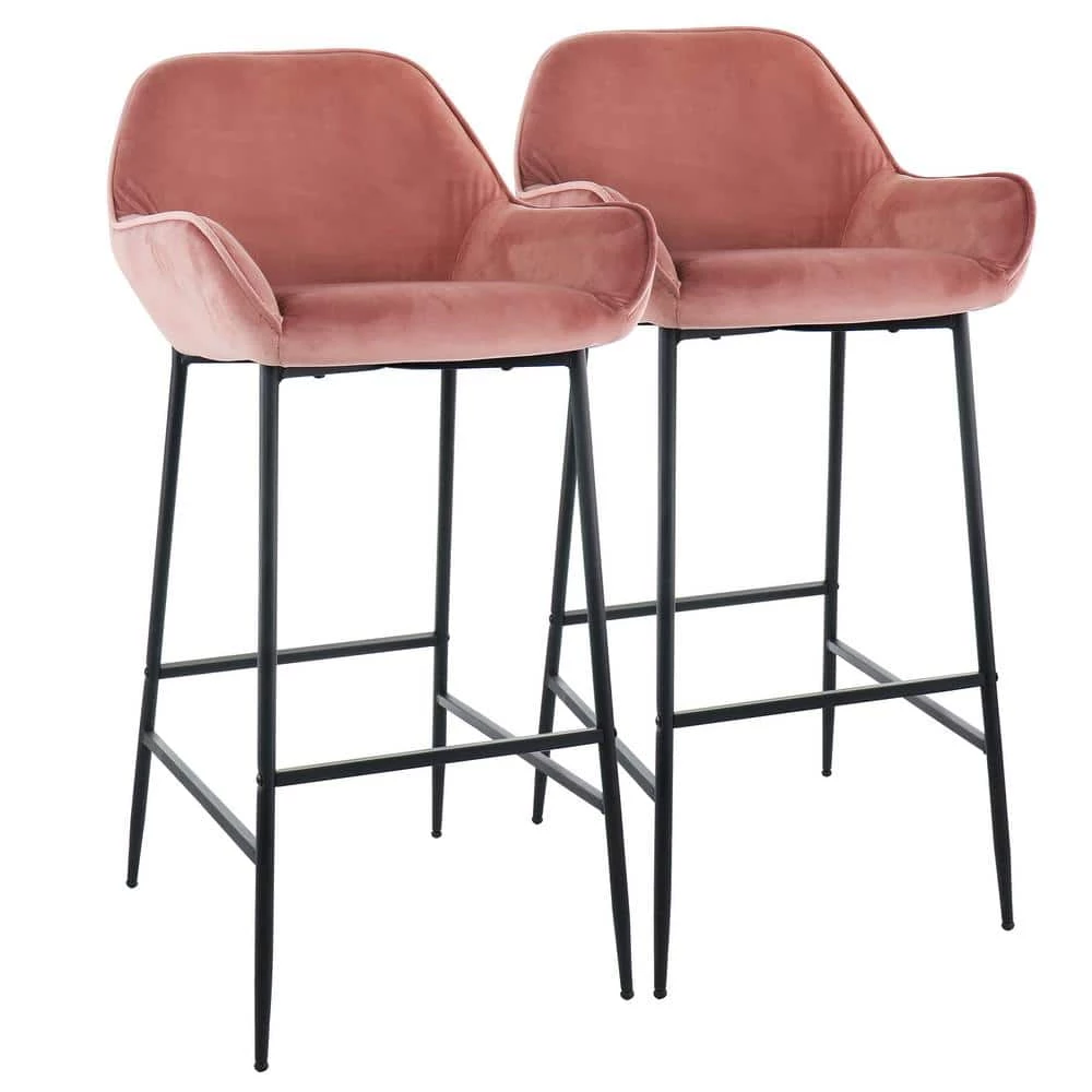 Add a stylish touch to your home bar or kitchen counters with the Elama 2-Piece Velvet Bar stools in Pink. This set of bar chairs is designed with a smooth velvet back and slanted arm rests for a modern and sleek look. Comes with all the tools needed for an easy and fast assembly, and chair height sits at 30.5 in. from floor to seat with a 40 in. total height. Constructed with a sturdy metal base and a firm cushioned velvet seat, these chairs are meant to last.