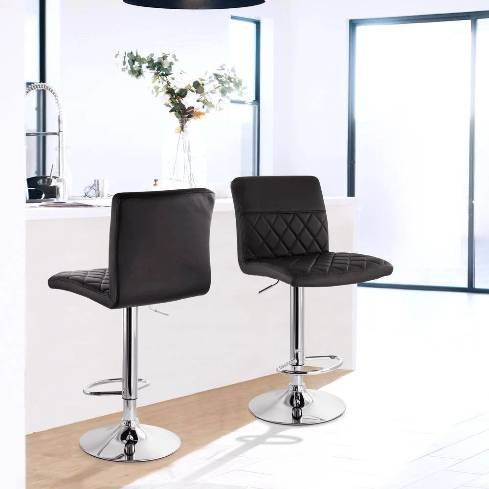 Add a stylish touch to your home bar or kitchen counters with the Elama 2-piece Tufted Faux Leather Adjustable Bar Stool in Black with Chrome Base. No handles ensure these stools fit easily side by side without the bulkiness. Features a swivel base and adjustable height with foot rest. This set comes with all the tools you need to put these stools together for an easy and fast assembly. The Elama adjustable chair is also crafted from quality and sturdy metal for a strong and long-lasting design.