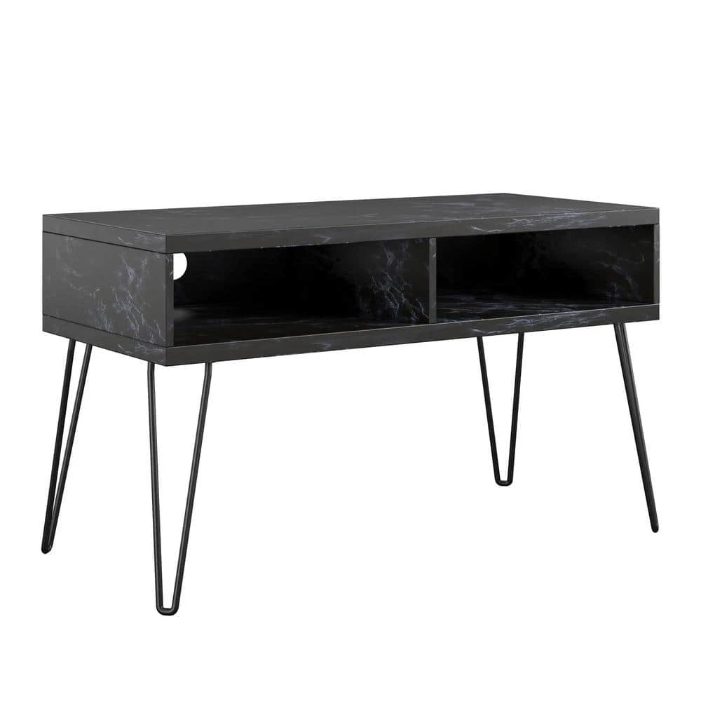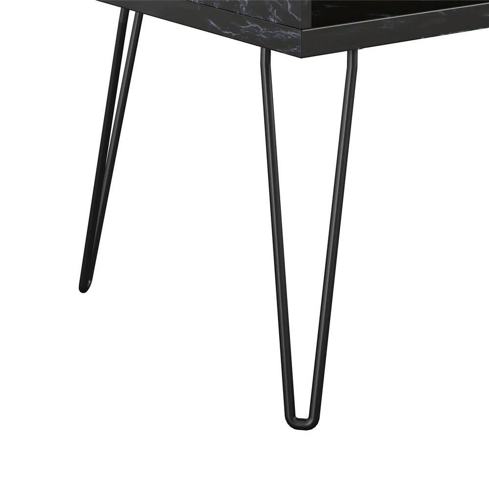 - Made of PVC laminated particleboard, the TV Stand features a faux black marble finish with black metal hairpin legs for a mix of retro and glam styles you will love