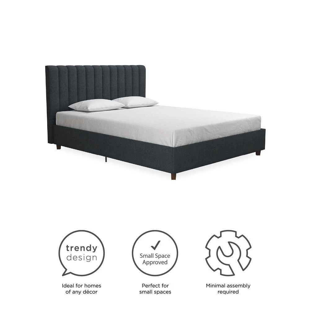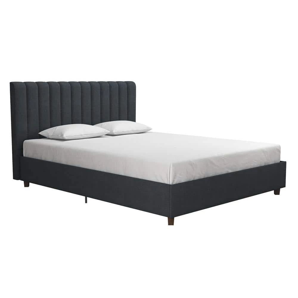 Luxury and glamour are in every detail of the Novogratz Brittany Upholstered Bed. Designed with a lavish modern style, this platform bed has a ribbed tufted headboard and oak colored legs that make it the perfect statement piece. The Brittany bed is made with a robust wood frame and upholstered in premium linen, adding elegance to your room. It comes with a bentwood slat system that provides optimal support as the slats adapt to the pressure exerted on them. It also includes side rails and additional metal legs to ensure stability and support. The comfortable cushioning of the headboard gives your body all the support needed to sit and relax. Just add the Novogratz Atlas Hybrid Mattress, a couple of pillows and a comfy duvet and you’ll be all set! Available in multiple colors and sizes.
