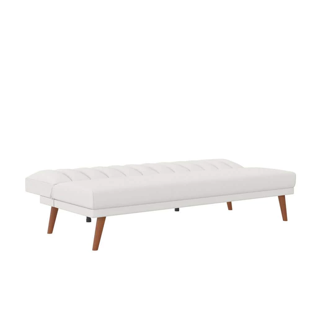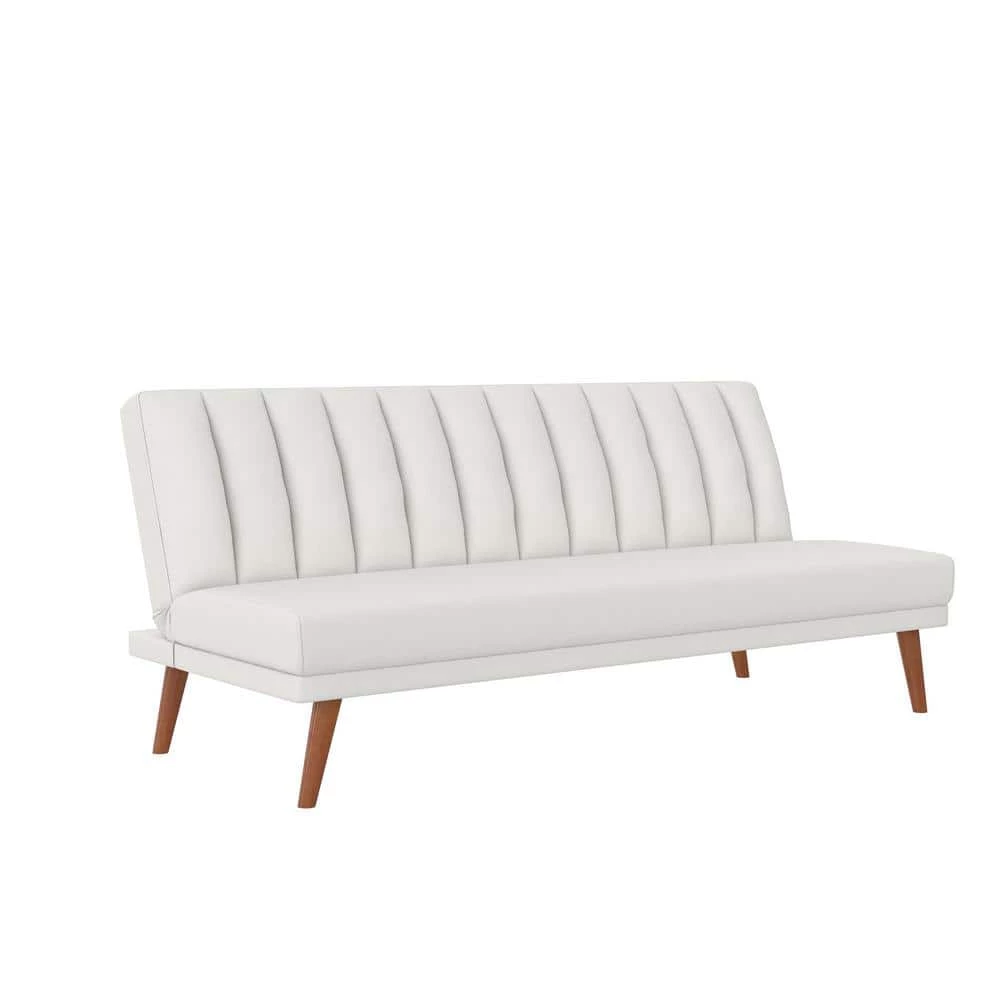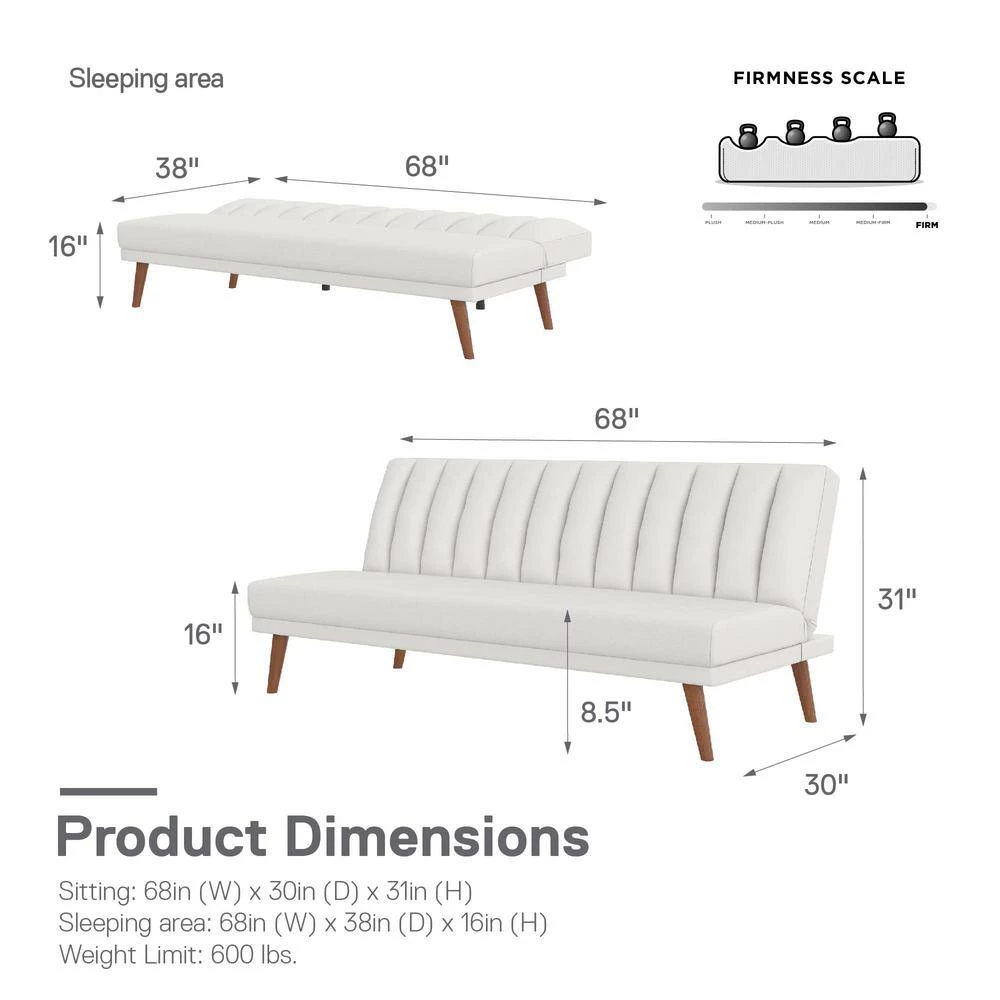 - Distinctive style that you’ve grown to love now in an armless version for increased space maximizing versatility, the futon showcases classic ribbed tufting on the backrest with casually slanted wood grain legs and refined retro mid-century modern charisma