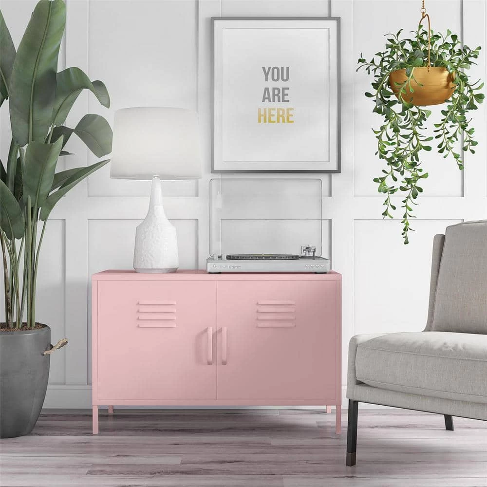 Add valuable storage and a fun pop of color anywhere in your home with the Novogratz Cache 2-Door Metal Locker Accent Cabinet. Made of powder-coated metal, for nostalgic twist to your storage solution. The metal can easily be cleaned with a damp cloth so you can store anything from cleaning supplies to extra throws and board games. The 2-shelves provide plenty of space for storage no matter where you need it. The Cabinet ships flat to your-Door and requires assembly upon opening. 2 adults are recommended to assemble. Once assembled, the Cabinet measures to be 25.2 in. H x 39.37 in. W x 15.75 in. D.