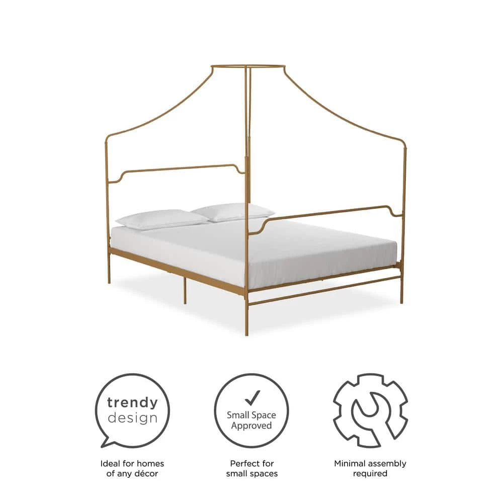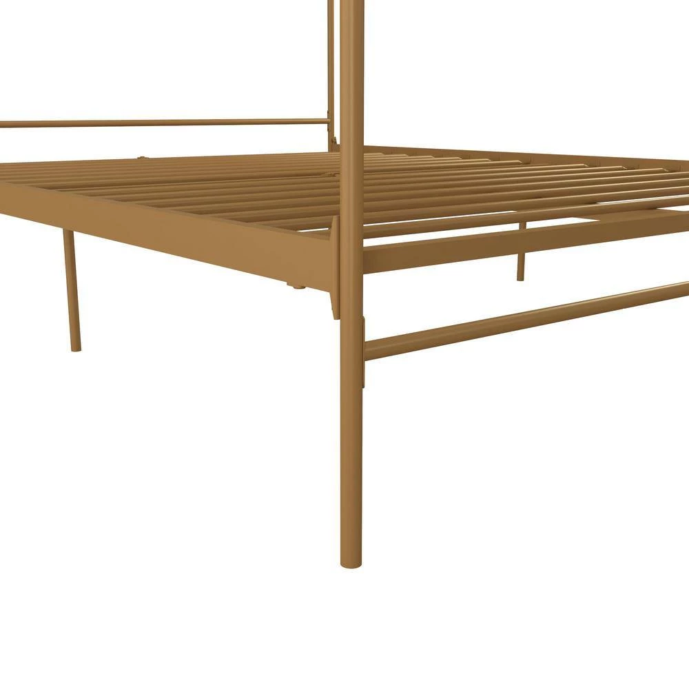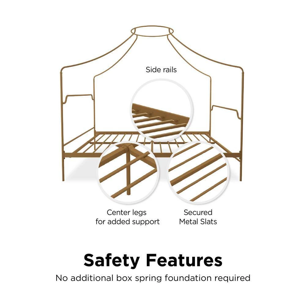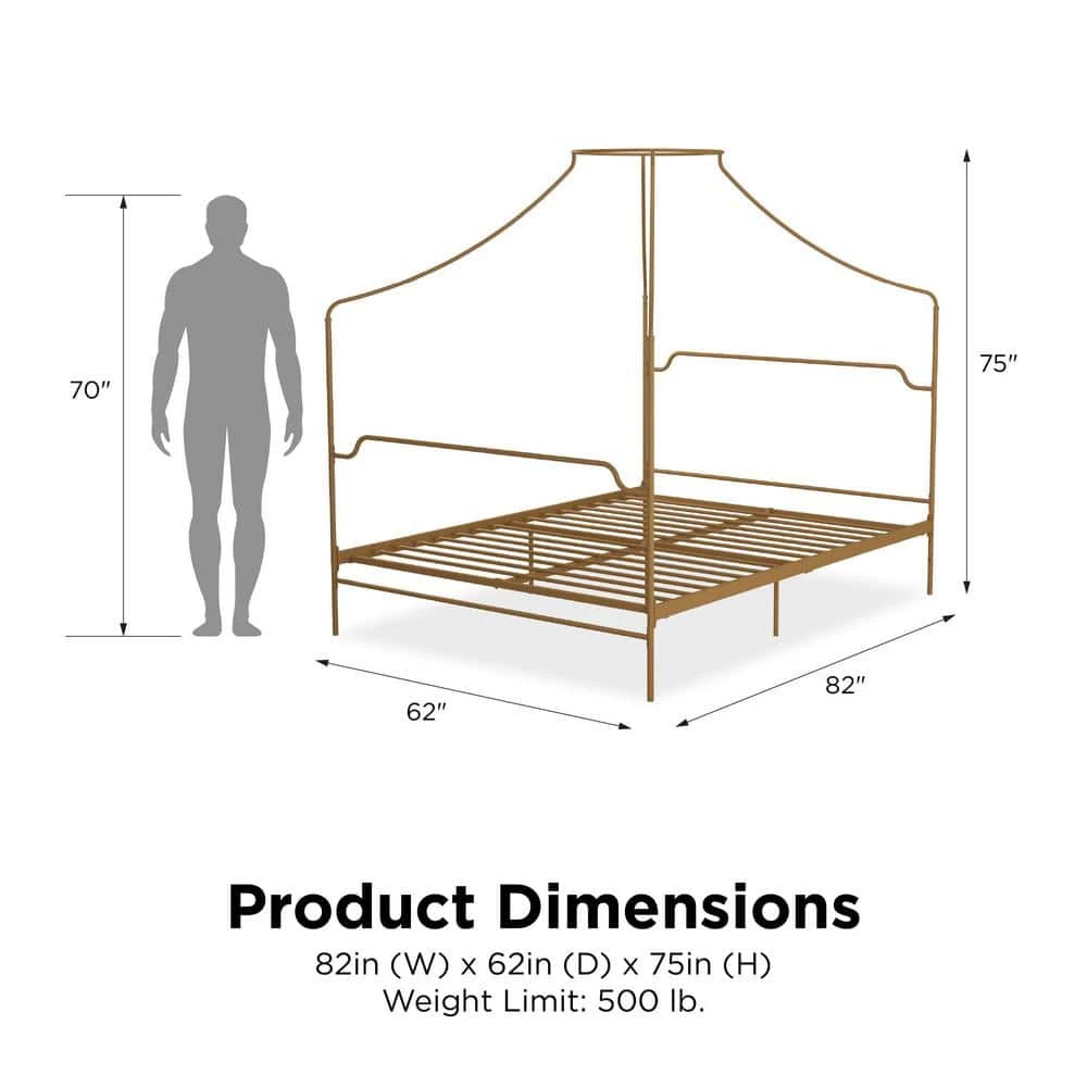 The Novogratz Camilla Metal Canopy Bed has a design that will make you feel royal. The delicately designed metal frame has a vintage style that will add instant sophistication to your bedroom. The four canopy posts meet in the middle to create a piece that will make a beautiful statement and complement the rest of your room decor. The Camilla’s all-metal frame includes side rails, additional center legs and secured slats to provide stability and durability. The secured metal slats also remove the need to purchase any additional box spring or foundation as they offer mattress support and breathability for long-lasting comfort. What’s more, the mattress base is adjustable to allow you to convert it between a 6.5 in. and 11 in. clearance depending on you under bed storage needs. This means you will now have a place to store your seasonal clothing you can’t seem to find the space for. Available in multiple colors, the Novogratz Camilla Metal Canopy Bed is offered in Twin, Full, Queen and King size. Mattress sold separately.