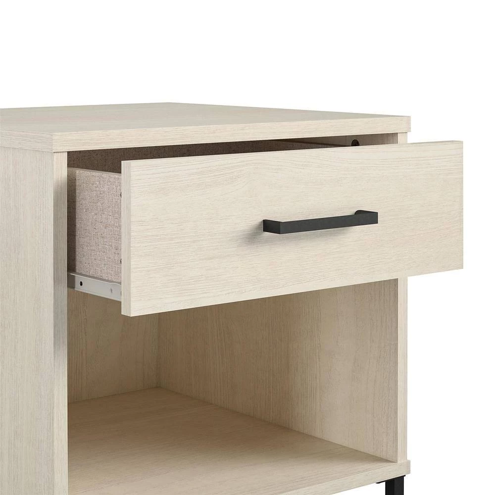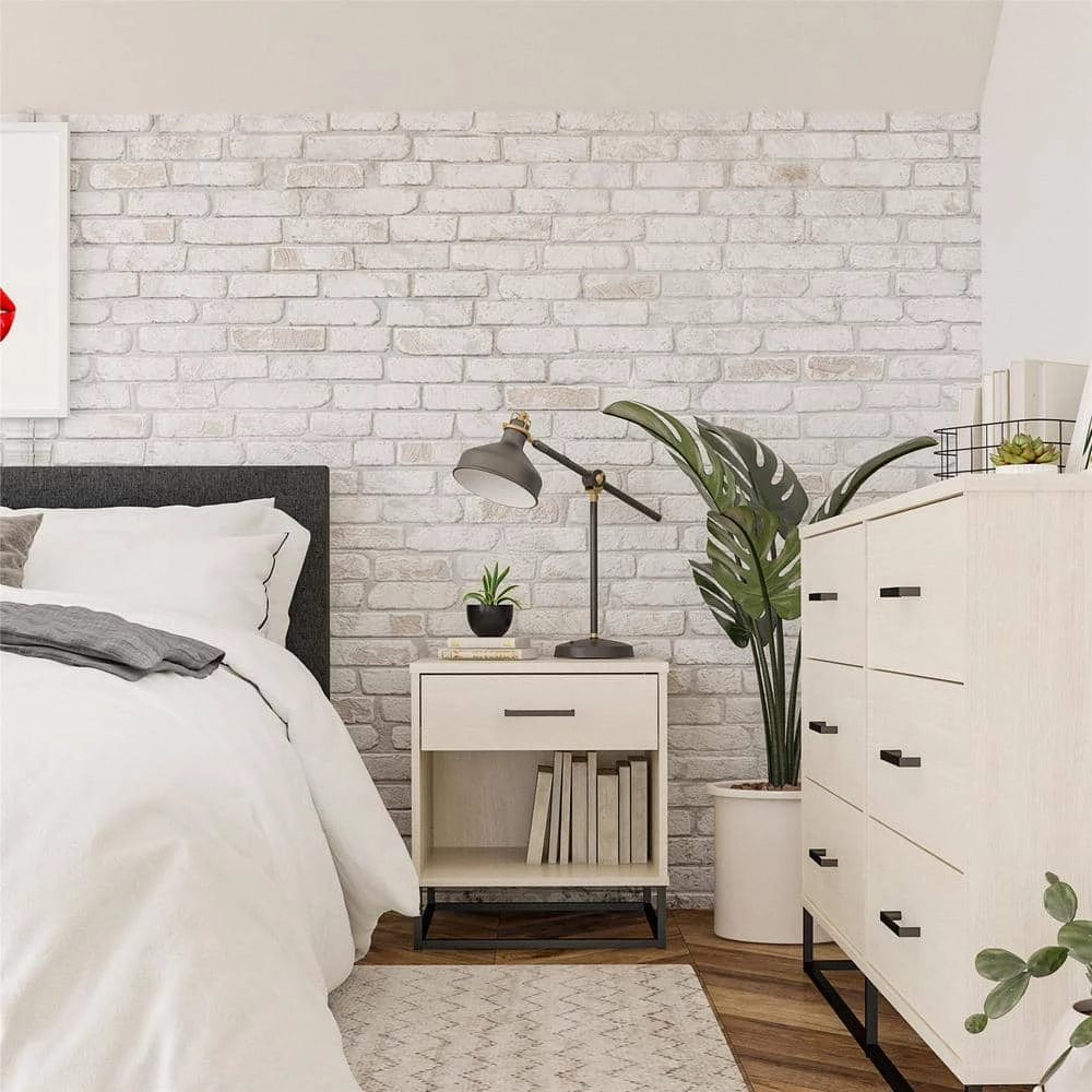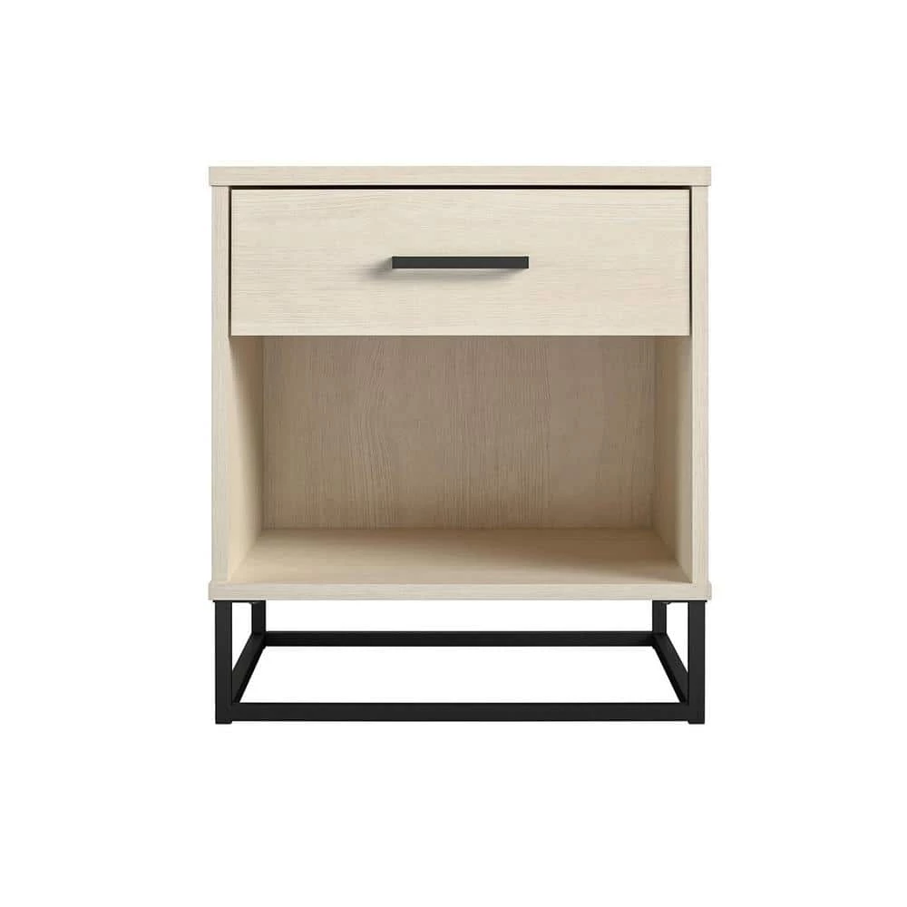 Upgrade your master bedroom or guest room with the Novogratz Kelly Nightstand. This trendy Nightstand combines both rustic and modern styles with the off-white woodgrain finish on the laminated particleboard and the powder-coated metal base. Keep your alarm clock, cellphone, and other nighttime essentials on the top surface to have everything you need for some shut eye within reach. The open lower cubby is perfect for books and magazines for nighttime reading. The convenient drawer can hold smaller items to keep your bedside organized. The Nightstand ships flat to your door and requires assembly upon opening. Two adults are recommended to assemble. Once assembled, the Nightstand measures to be 22.05″H x 19.76″W x 19.69″D.