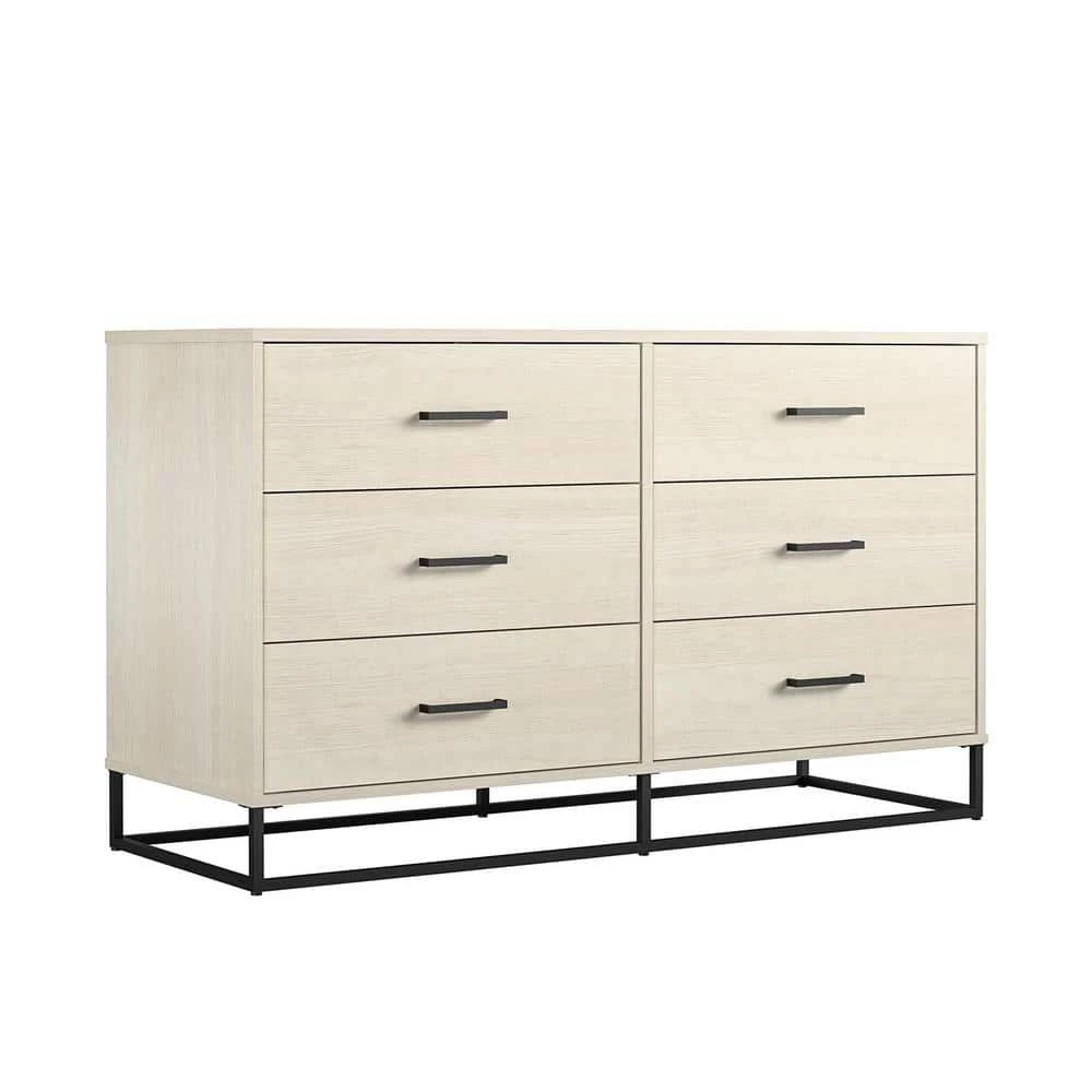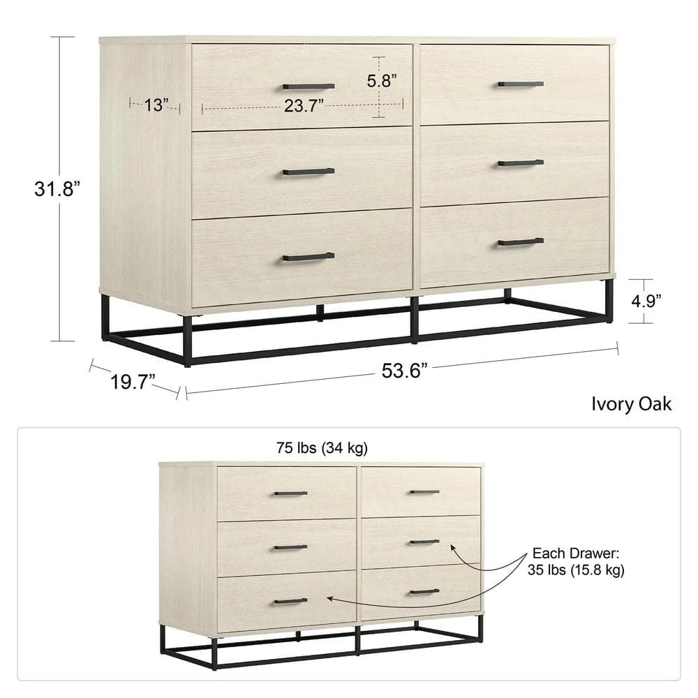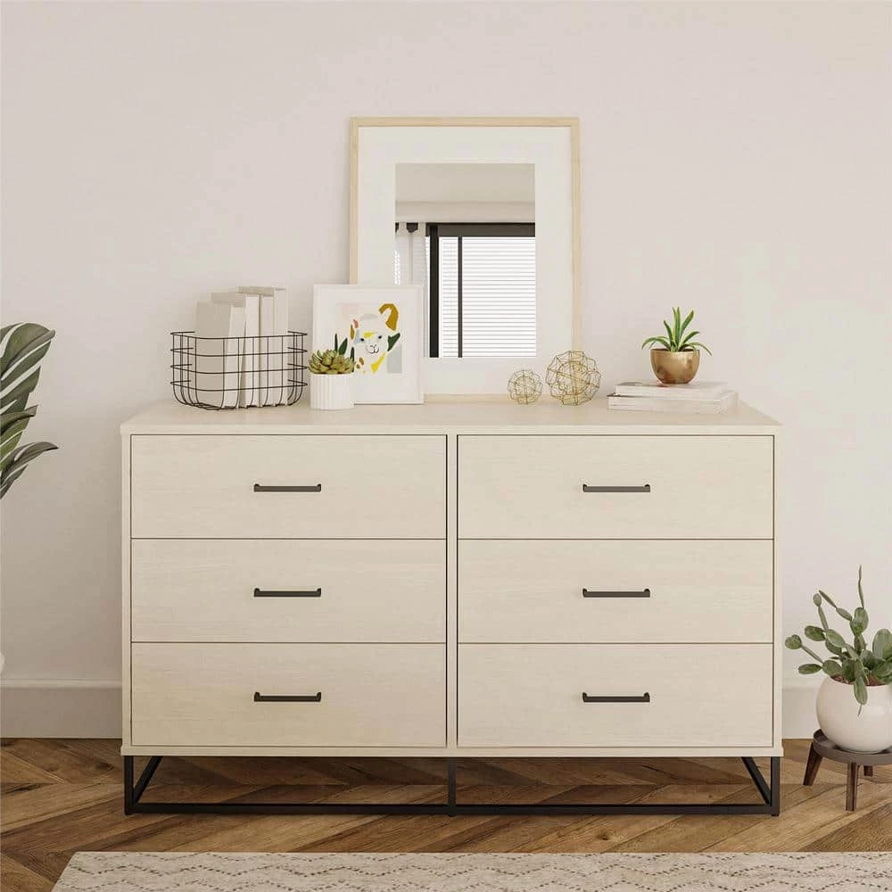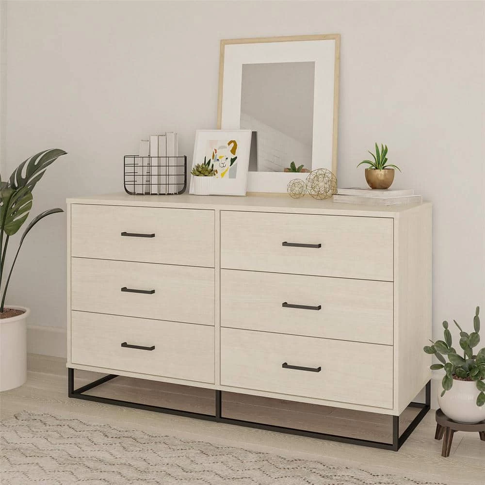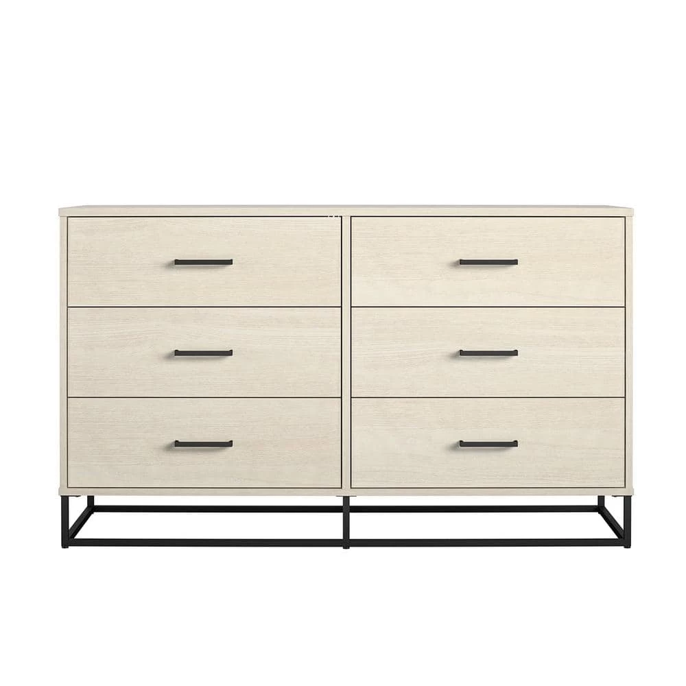 Clean out the clutter in your closet by storing away folded clothing in the Novogratz Kelly 6 Drawer Dresser. This trendy Dresser combines both rustic and modern styles with the off-white woodgrain finish on the laminated particleboard and the powder-coated metal base. Store away sweaters, jeans, t-shirts, and extra linens in the 6 spacious drawers. Each drawer is finished with a linen-look paper to prevent clothes from snagging on raw edges. The durable metal slides will keep the drawers opening and closing smoothly for years. A wall anchor kit is included to secure the Dresser to the wall and prevent tipping injuries. The Dresser ships flat to your door and requires assembly upon opening. Two adults are recommended to assemble. Once assembled, the Dresser measures to be 31.77″H x 53.62″W x 19.69″D.