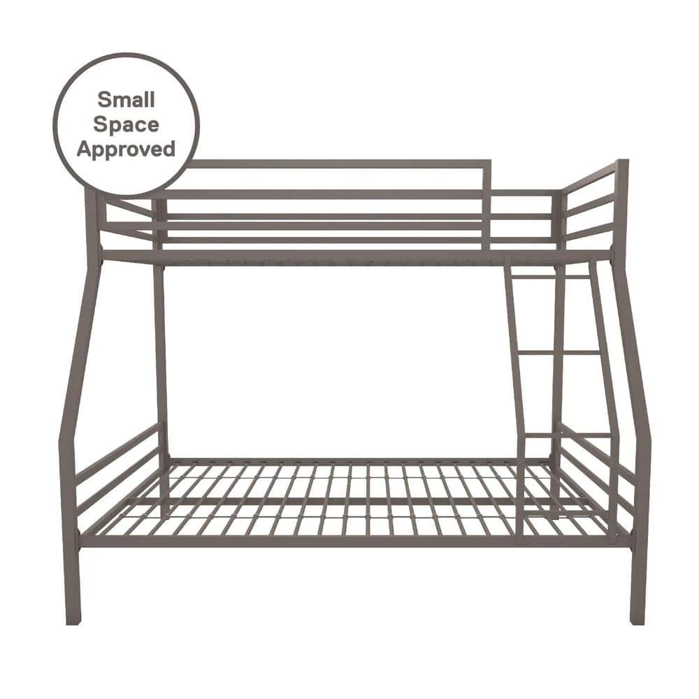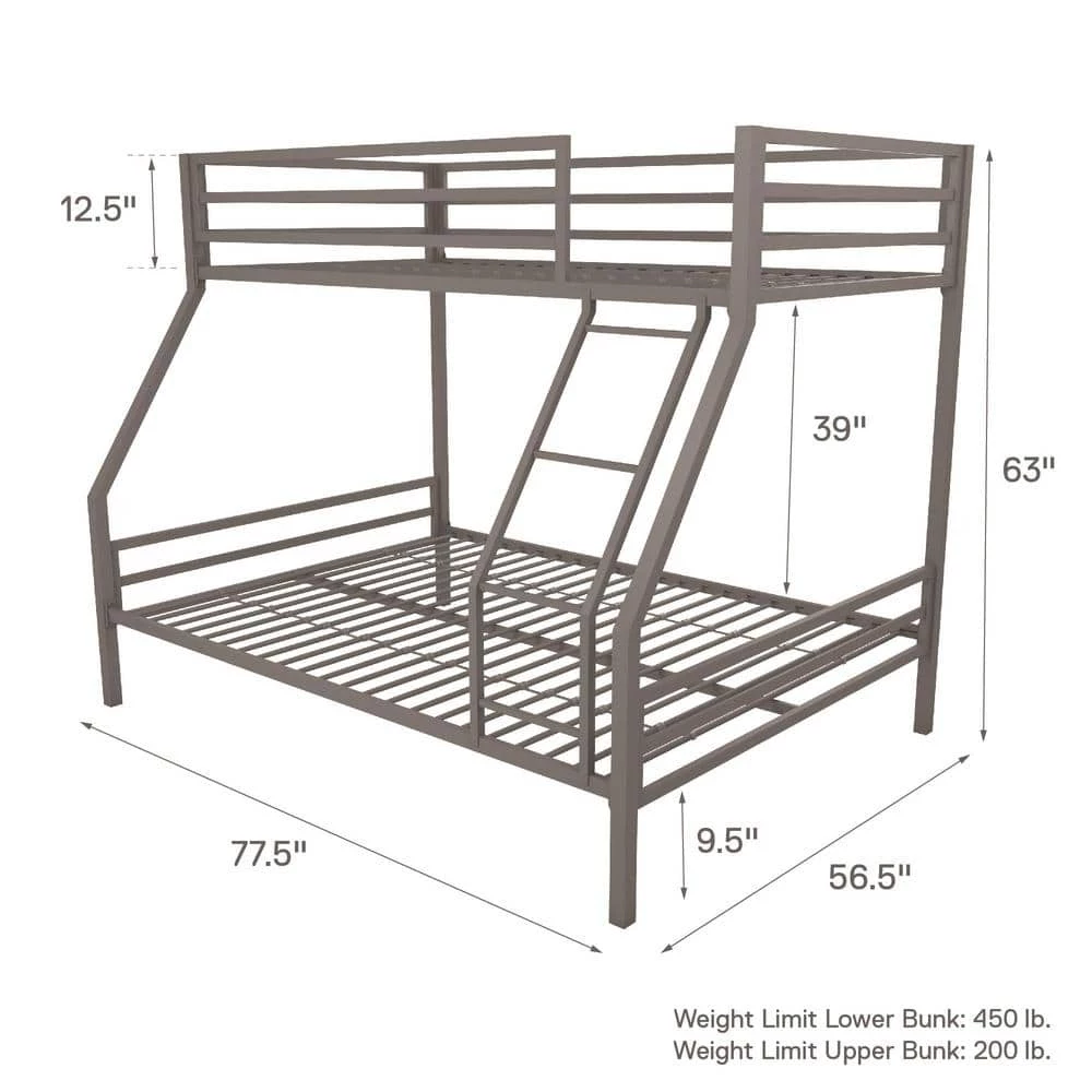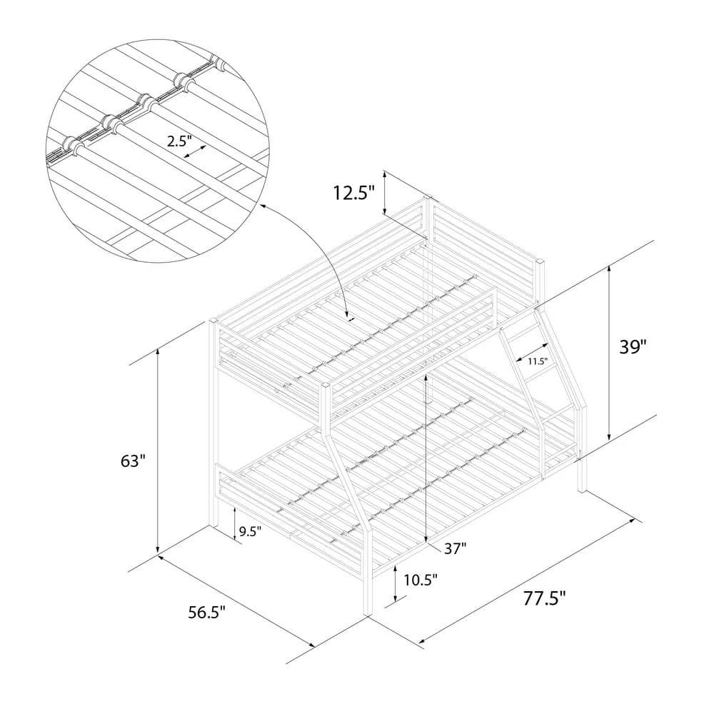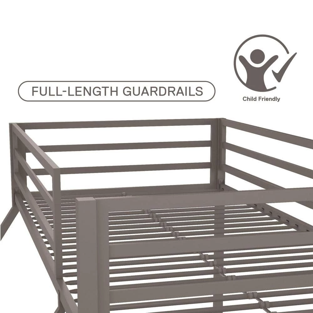Give them more space to play with the Novogratz Maxwell Twin/Full Metal Bunk Bed! Made with a sleek, sturdy metal frame, this bunk bed has an industrial modern design that is also functional and ideal for space saving. The frame comes with metal slats and side rails that guarantee support and stability as well as safety rails on the top bunk and an attached ladder that sits above the floor to ensure safety when climbing to the top bunk. This bed accommodates one Twin size mattress and a Full size one and does not require additional foundations. The Novogratz Maxwell Twin/Full Metal Bunk Bed comes in three trendy colors: pink, grey and navy blue, that will make sure to accentuate any room!