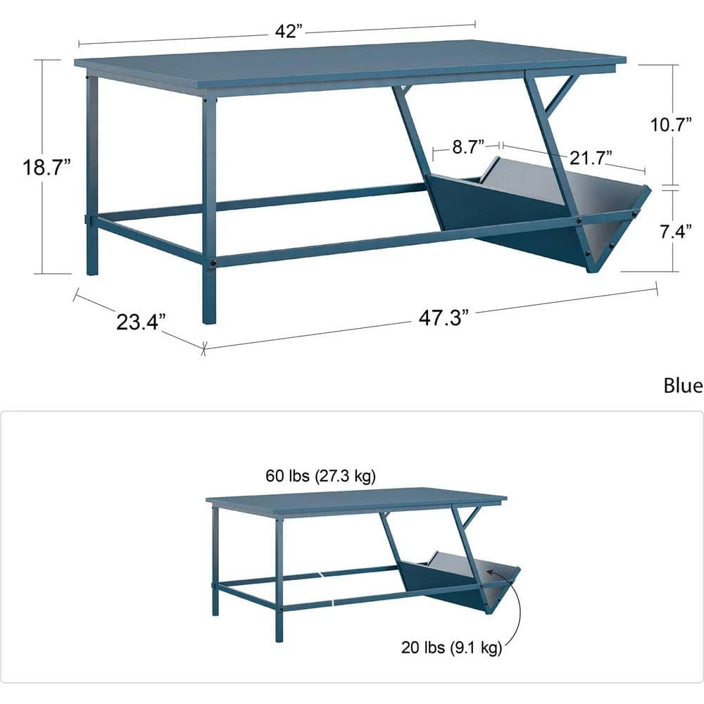 - The Coffee Table ships flat to your door and 2 adults are recommended to assemble. The table top can hold up to 60 lbs. while the side shelf can hold 20 lbs. Assembled dimensions: 18.65″H x 42″W x 23.35″D