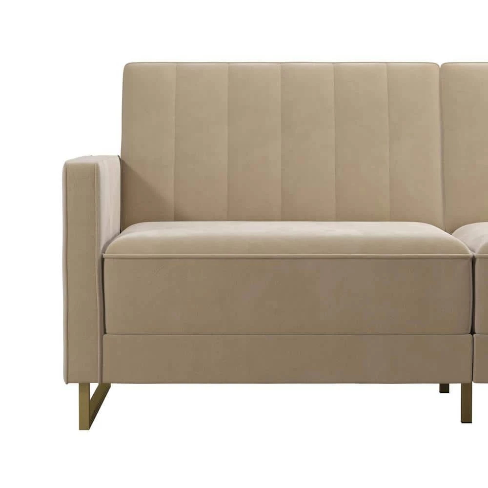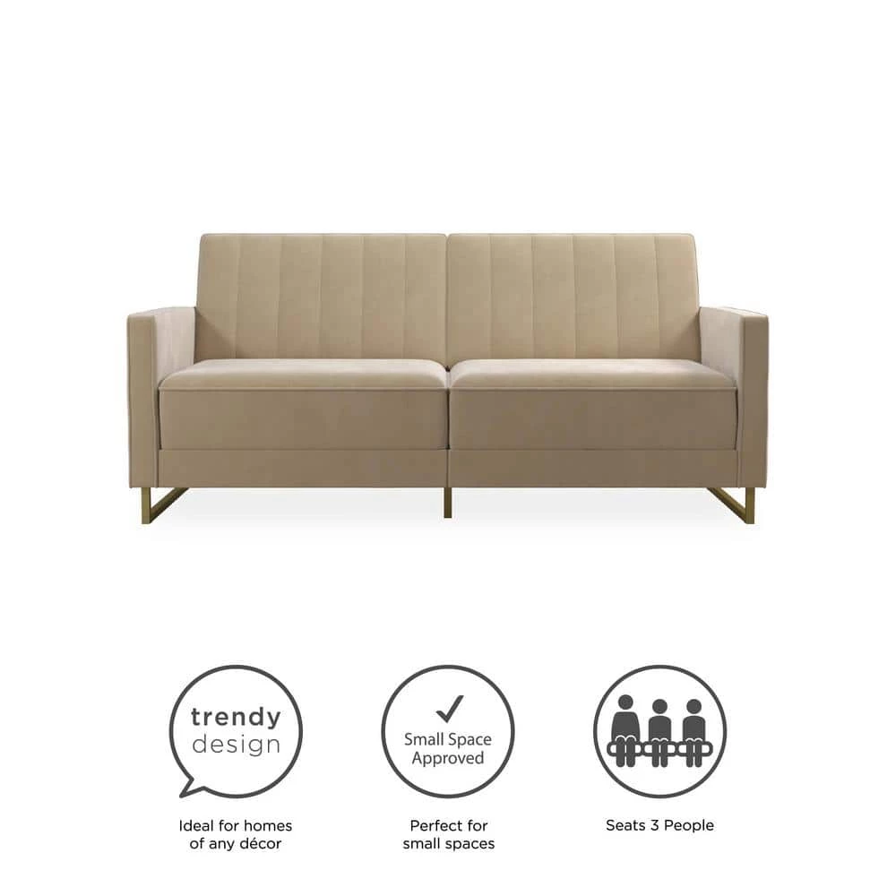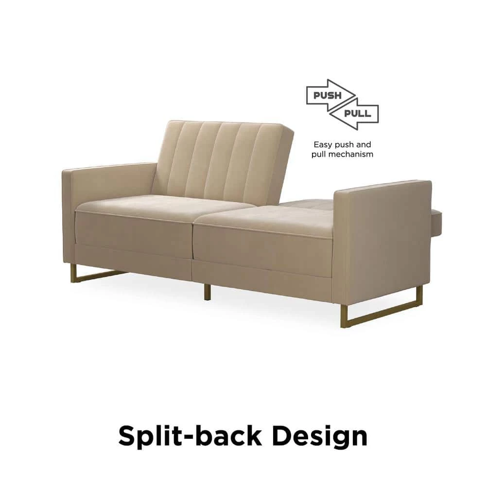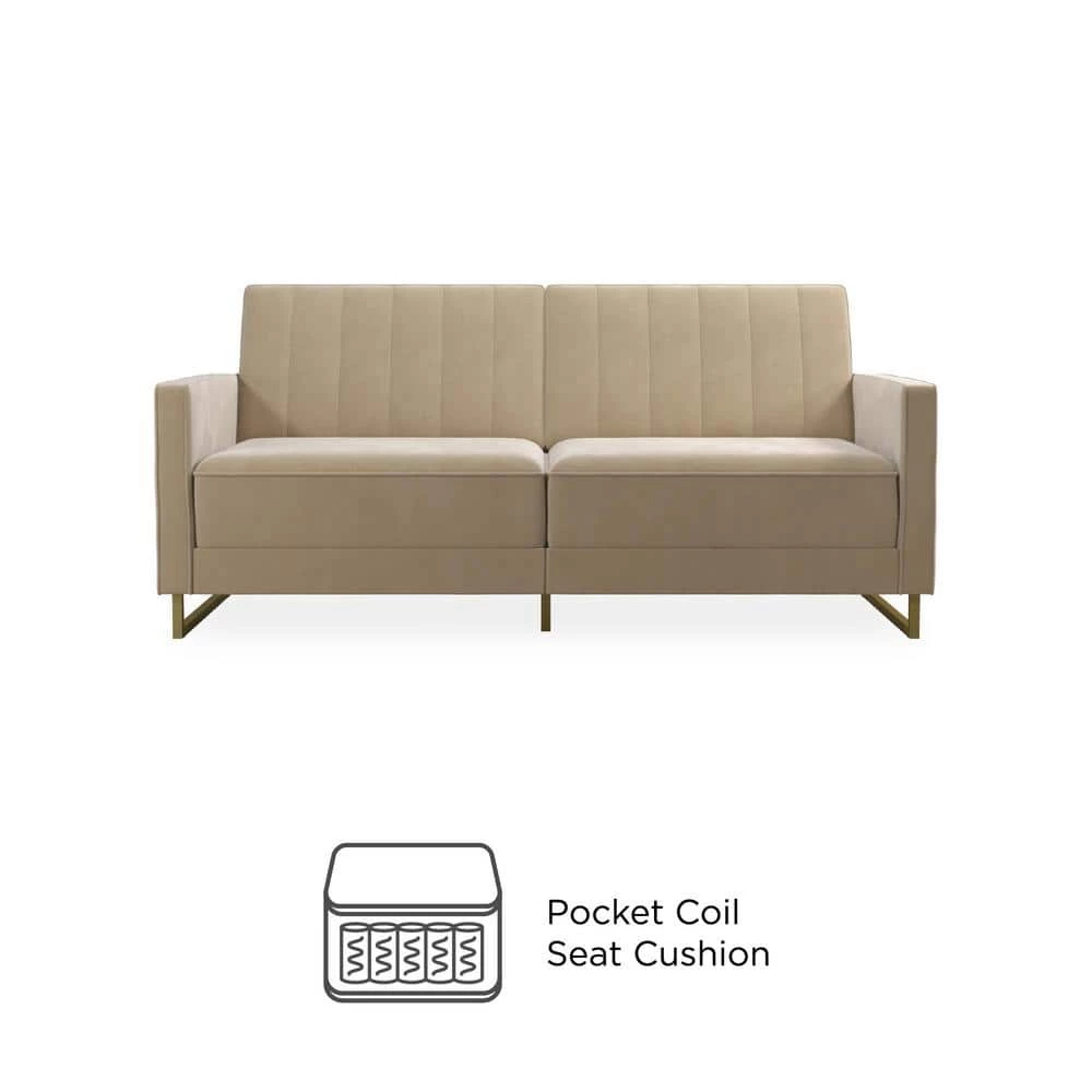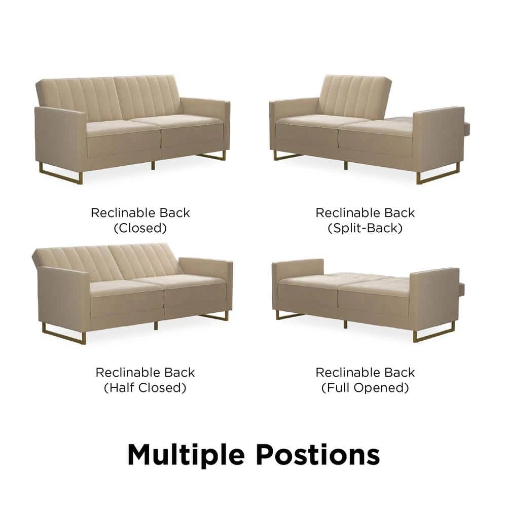The Novogratz Skylar Coil Futon stands out from the rest and makes a statement. Modern and trendy, the futon is designed with a ribbed tufted cushioned back that features vertical stitching details in the backrest. The Skylar is upholstered in rich velvet and sits on trendy gold powder coated metal legs to add a touch of modern glam to your room decor. This upholstered futon is constructed with pocket coil seating to offer optimal comfort for you and your guests during a movie night. This versatile futon is also the perfect solution for accommodating overnight guests as its multi-functional split-back design allows you to independently recline the backrest between three positions: sitting, lounging and sleeping. Available in a variety of colors, the Novogratz Skylar Coil Futon is a great option if you want a piece that will instantaneously add functionality and personality to your home. What are you waiting for?