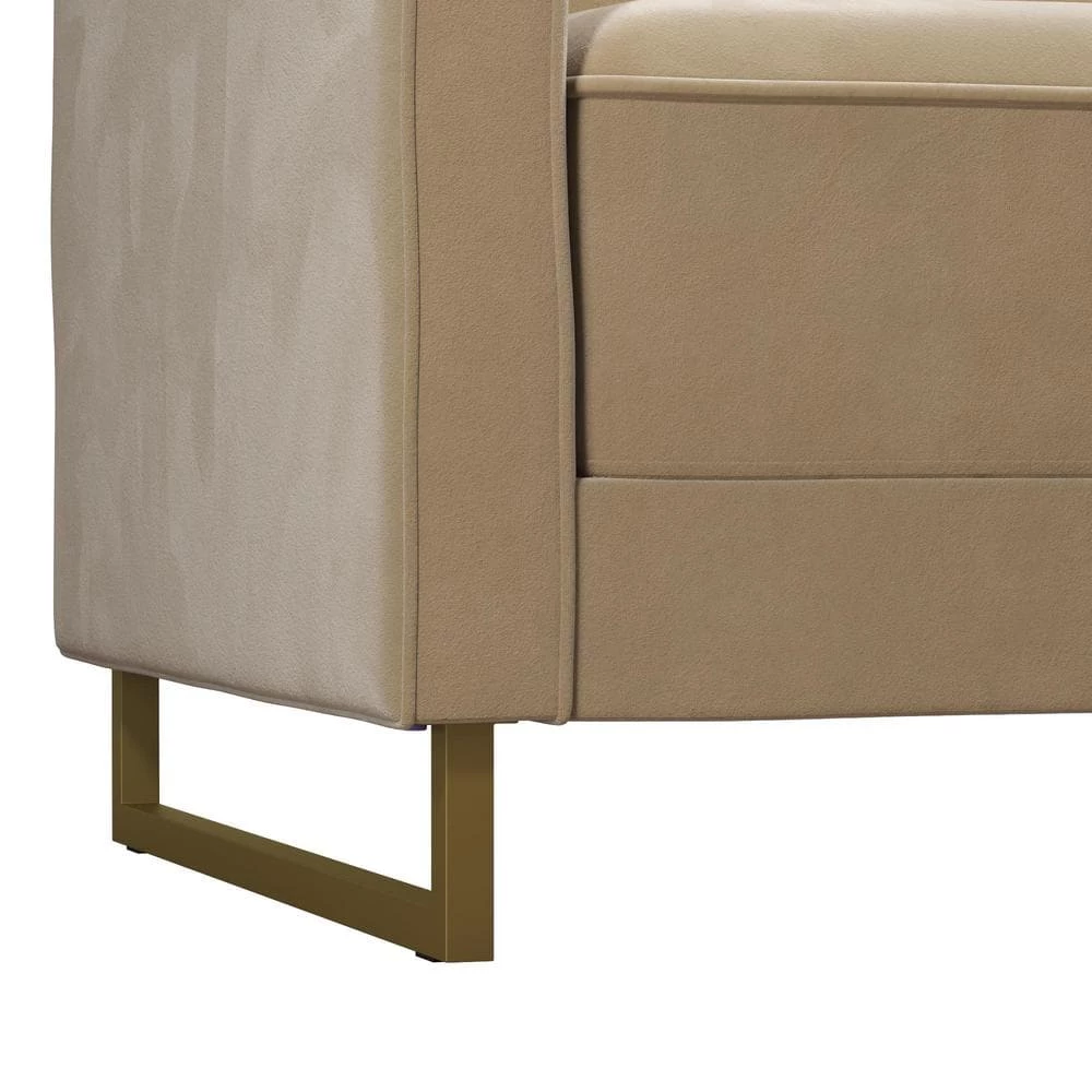 - Modern design fully upholstered in rich velvet with ribbed tufted cushioned back and gold powder coated metal legs.