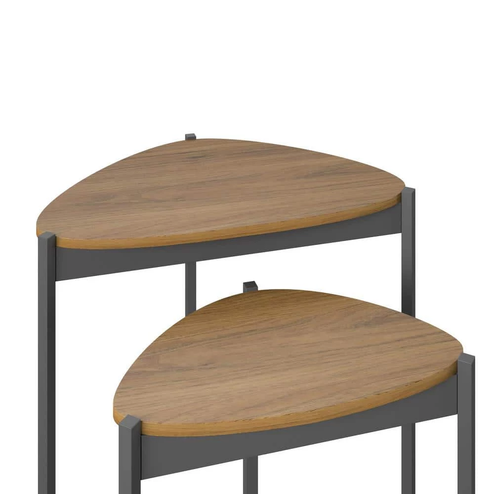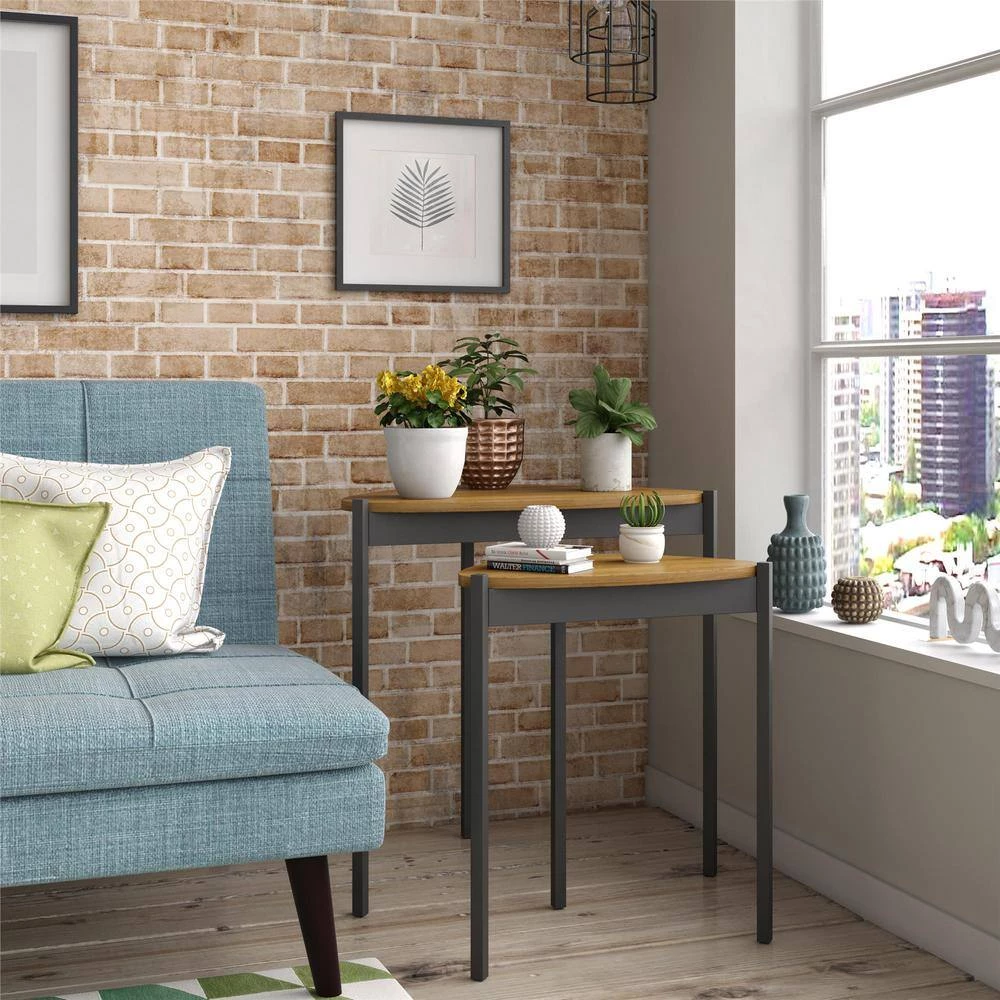 Add unique and space-saving table space to your living room with the Novogratz Tallulah Nesting Tables. Made of laminated particleboard with sturdy powder-coated metal legs, the warm walnut woodgrain finish on the tabletops pairs perfectly with the dark gray metal legs for a beautiful look for your space. Use the tables separately to hold all of your drinks and snacks for movie or game night and simply stack them together when not in use to save valuable space. The compact design is perfect for first apartments and smaller spaces. The unique tabletop shape is sure to make the tables stand out and complement your style. The Nesting Tables ship flat to your door and require minimal assembly upon opening. Once assembled, the taller table measures to be 24″H x 23.8″W x 15.7″D and the shorter table measures to be 20.9″H x 17.7″W x 11.3″D.